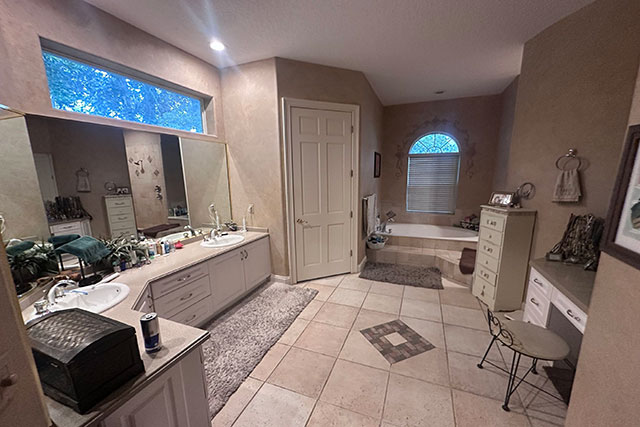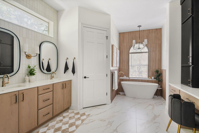 This light-filled primary bathroom blends warmth and modern simplicity with a calm, spacious feel. Natural wood cabinetry is paired with clean white countertops, softly rounded mirrors, and a mix of matte black and warm brass accents. A freestanding soaking tub framed by vertical wood paneling creates a serene, spa-like focal point. Large-format marble-look flooring and thoughtful lighting complete the space, balancing everyday function with refined, timeless design.