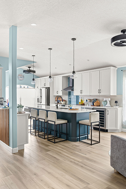 This Melbourne, FL kitchen remodel embraces a fresh coastal aesthetic with a sophisticated, layered palette. Crisp white shaker cabinetry pairs beautifully with a bold navy blue island topped in white quartz, creating a striking focal point throughout the space. A teal vertical tile backsplash adds texture and coastal charm behind the professional-grade range and custom hood. Matte black pendant lighting and hardware provide a refined modern edge, while light wide-plank flooring and soft blue walls keep the atmosphere bright and airy. The result is a functional, elegantly styled kitchen designed for the Florida coastal lifestyle.